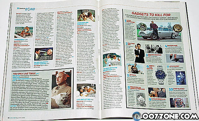 26 페이지에 걸쳐 007 시리즈의 50년 역사를 되돌아 본 엔터테인먼트 위클리의 007 시리즈 50주년 기념 스페셜 이슈엔 007 시리즈 1탄부터 22탄까지 소개, 007 시리즈 23탄 ‘스카이폴(Skyfall)’ 프리뷰, 조지 레이전비(George Lazenby) 인터뷰, 가젯과 로케이션, 비하인드 더 씬 포토 등이 실렸다.