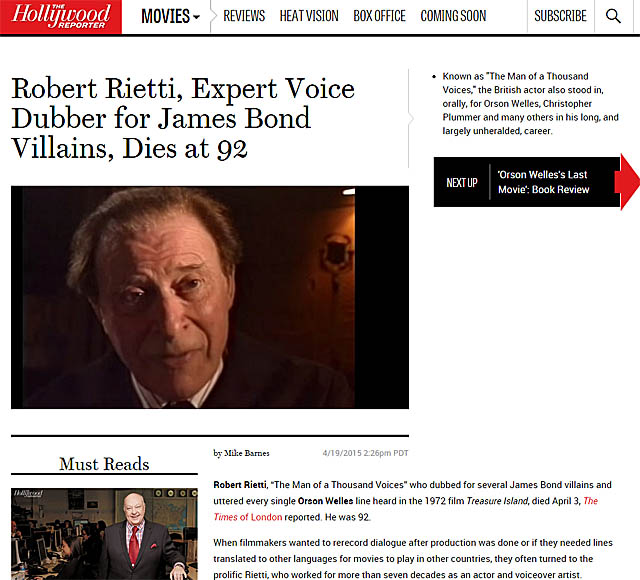 헐리우드 리포터는 ‘썬더볼(Thunderball)’, ‘유어 아이스 온리(For Your Eyes Only)’ 등 클래식 제임스 본드 시리즈에서 악역의 목소리 더빙을 담당했던 ‘천가지의 목소리를 가진 사나이(The Man with the Thousand Voices)’, 로버트 리에티가 사망했다고 전했다.