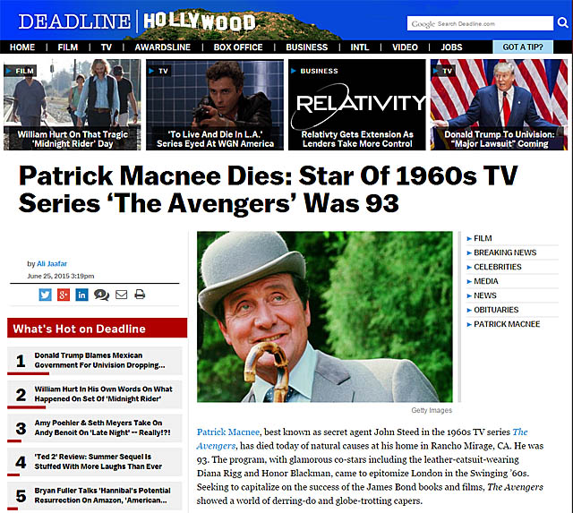 영국 배우 패트릭 맥니(Patrick MacNee)가 세상을 떠났다. 패트릭 맥니가 미국 캘리포니아 주 자택에서 사망했다고 데드라인이 전했다.