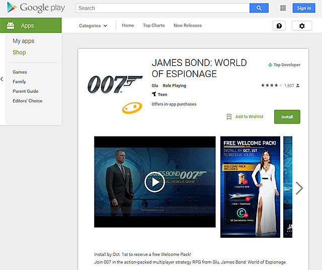 모바일 게임 회사 글루 모바일(Glu Mobile Inc.)의 공식 제임스 본드 모바일 게임 ‘제임스 본드: 월드 오브 에스피오나지(James Bond: World of Espionage)’가 출시되었다.