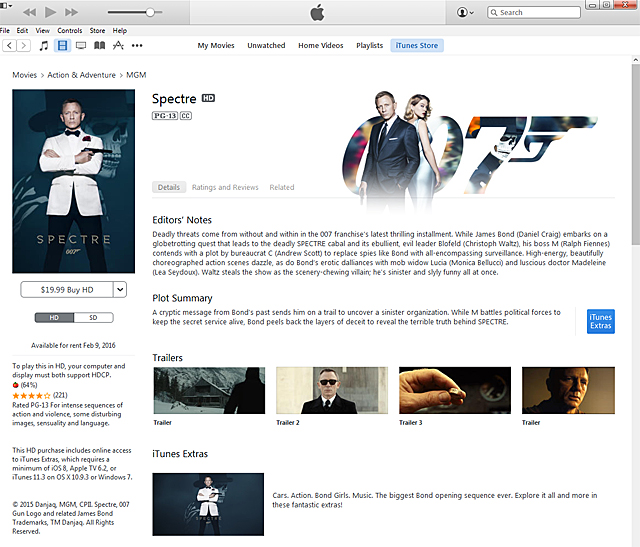 ’007 스펙터’ 디지털 HD는 미국 아이튠스 스토어, 아마존닷컴 등 디지털 무비 스토어에서 판매 중이다. 가격은 $19.99. SD 버전은 $14.99에 판매되고 있다.