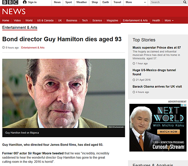 영국 BBC는 네 편의 제임스 본드 시리즈를 연출한 영국 영화감독 가이 해밀튼이 스페인의 마요르카(Majorca) 섬에서 세상을 떠났다고 보도했다.